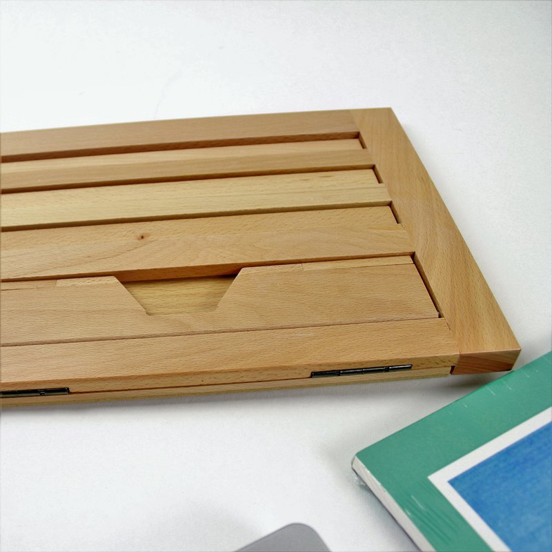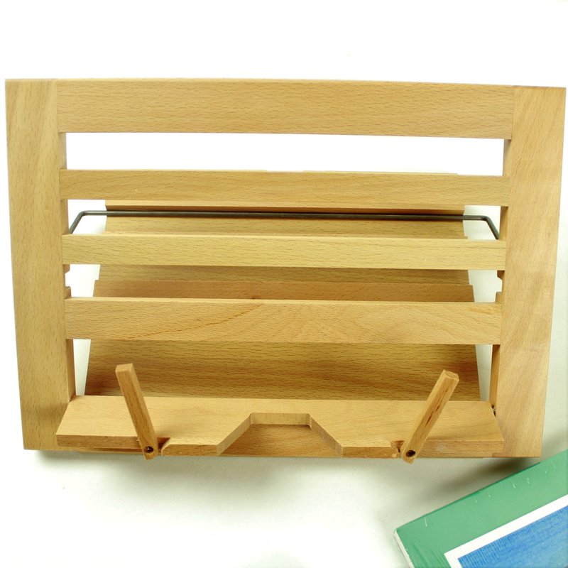 Vielseitiger Universal-Halter mit dreifacher Neigungsverstellung aus feinem Buchenholz. Der Winkel ist über eine Arretierung dreifach verstellbar. An der Ablage befinden sich zwei ausklappbare Haltestützen, damit das aufgelegte Objekt besser fixiert ist, oder sich die Seiten nicht selbstständig weiterblättern. Geringer Platzbedarf, da klein faltbar Viele Einsatzmöglichkeiten: