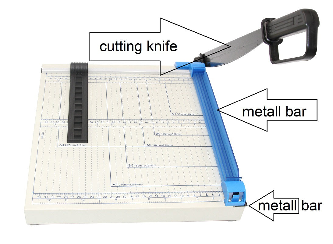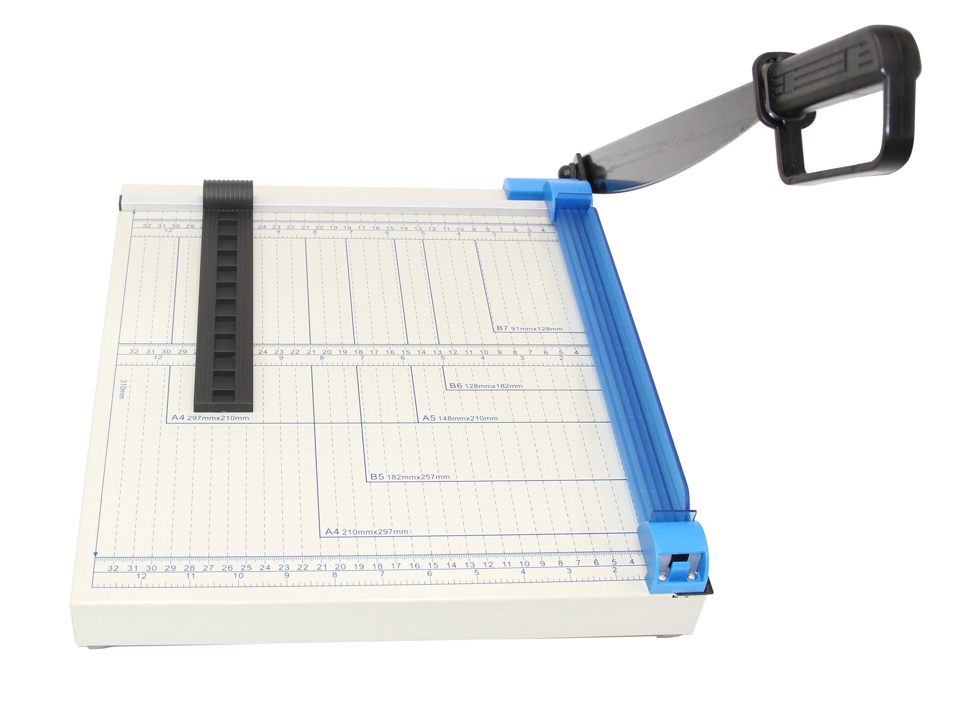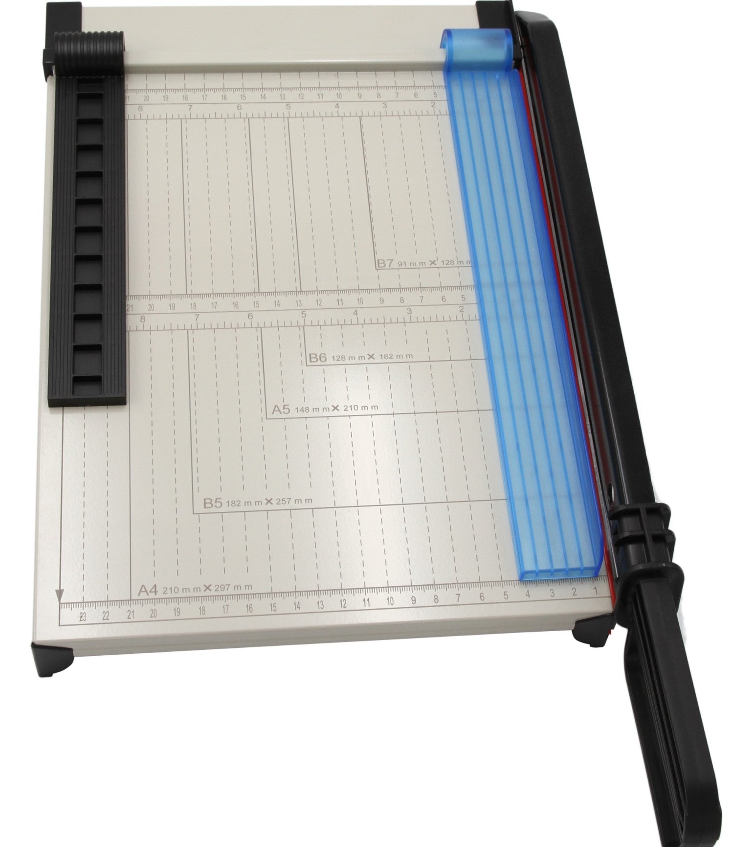 Handhabung: Sehr grosse Papier-Auflagefläche von insgesamt 32 x 34 cm. Ihr Vorteil: Auch bei Schnitten auf der kurzen A4-Seite liegen die Blätter komplett auf der Metallfläche auf und sind dann wesentlich einfacher zu schneiden. Leicht verschiebbarer 20 cm breiter Seitenanschlag für perfekte Schnitte. Durch etwas Druck auf die blaue Anpressleiste bringen Sie die Blätter sicher in Position. Die erhöhte Kante bietet Schutz vor Schneidverletzungen.