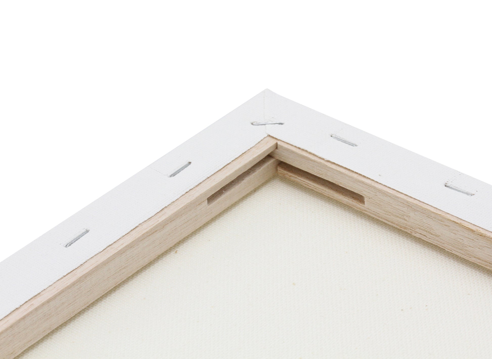Hochwertig gefertigte Keilrahmen mit rückseitiger Klammerung, ermöglicht die seitliche Bemalung der Leinwand.