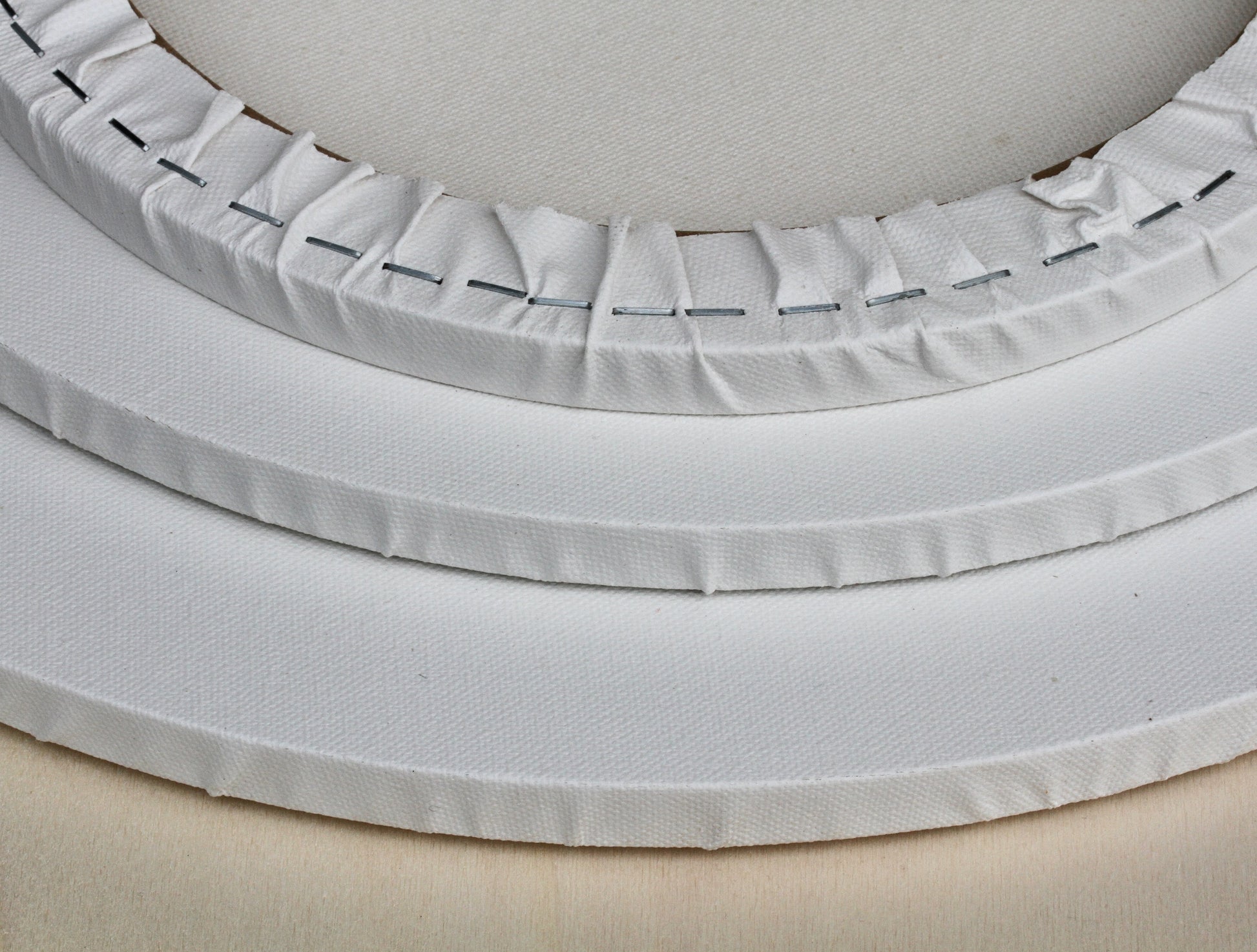 Runde Keilrahmen aus robustem Qualitäts-Maltuch. Die Aussenseite ist mehrfach weiss vorgrundiert und schwach saugend, ohne Bleich- und Lösungsmittel. Sofort malfertig - keine weitere Vorbehandlung mit Gesso oder anderen Malmitteln notwendig. Trommelhart bespannt für beste Ergebnisse auch bei dünnflüssigen Farben auf Wasserbasis. Runde Rahmen lassen sich nicht mit Holzkeilen nachspannen, deshalb verwenden wir bei allen Rund-Größen eine robuste 380gr/m² Leinwand aus 100 % Baumwolle.