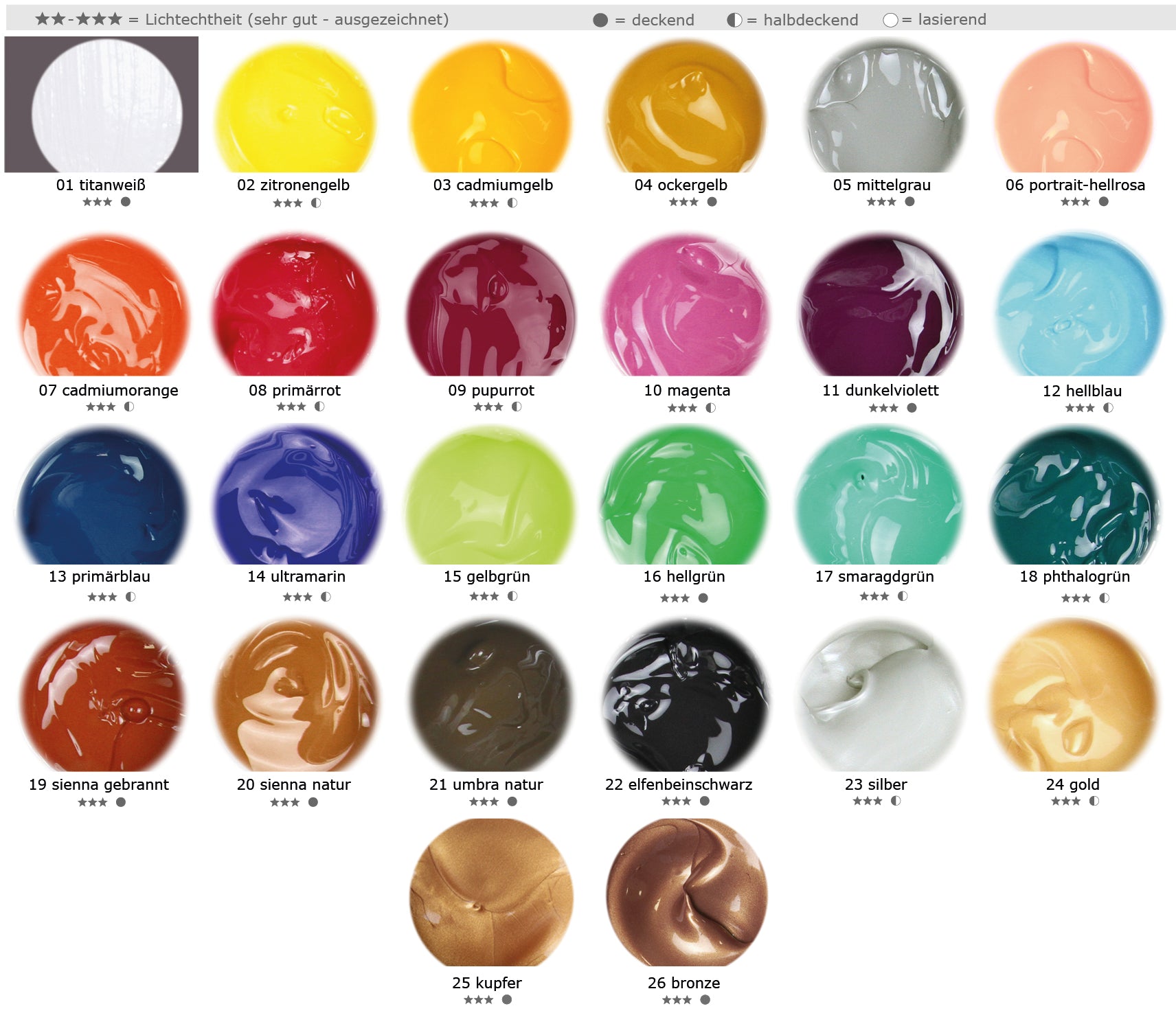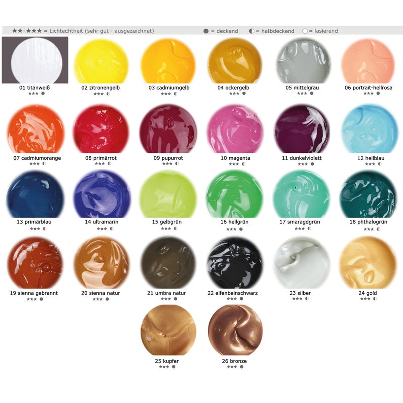 titanweiss, zitronengelb, cadmiumgelb, ockergelb, mittelgrau, portrait-hellrosa, cadmiumorange, naphthal-primärrot, purpurrot, magenta, dunkelviolett, hellblau, primärblau, ultramarinblau, gelbgrün, permanentgrün, smaragdgrün, phthalogrün, sienna gebrannt, sienna natur, umbra natur, elfenbeinschwarz, silber, gold, kupfe, bronze