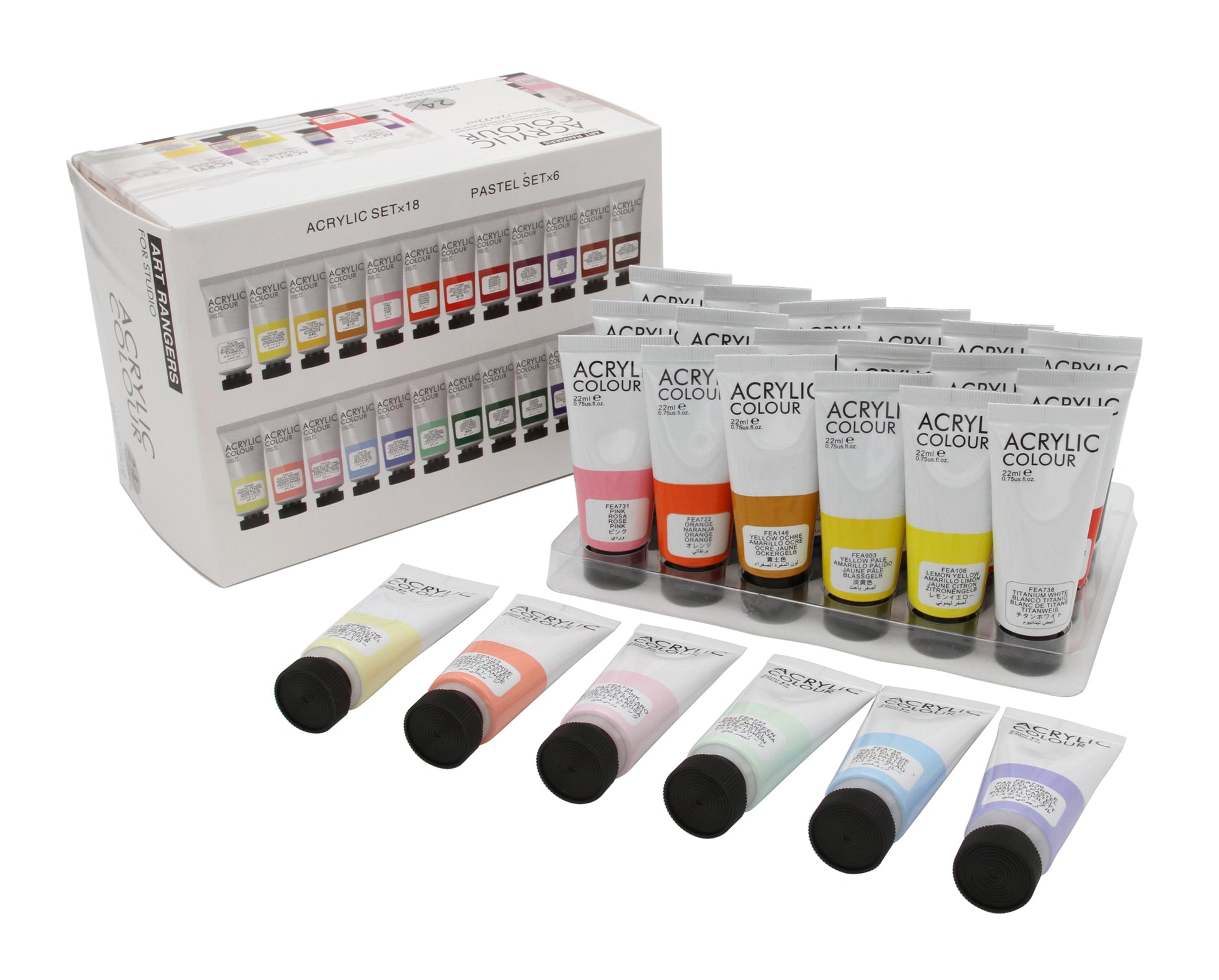 18 Acrylfarben in den Tönen titanweiss, zitronengelb, blassgelb, ockergelb, orange, brillantrot, pink, magenta, rosenrot, sienna gebrannt, umbra gebrannt, schwarz, violett, ultramarinblau, phthaloblau, grasgrün, viridiangrün, mittelgrün; 6 Pastellfarben in den Tönen gelb, orange, hellrosa, blau, violett und grün.