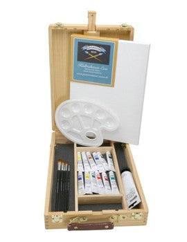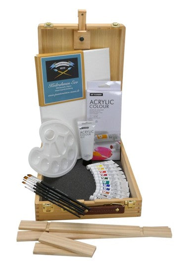 Tolles Set mit Acrylfarben, Pinsel, Palette und Leinwand! Alles gepackt in einem praktischen Koffer aus Kiefernholz, der sich hevorragend auch als Tischstaffelei für Keilrahmen bis 65 cm nutzen läßt, der Neigungswinkel ist stufenlos verstellbar. Keilrahmen bis 19 mm Stärke passen in die untere Ablage, tiefere Keilrahmen setzt man einfach zum Malen auf die Ablage auf.