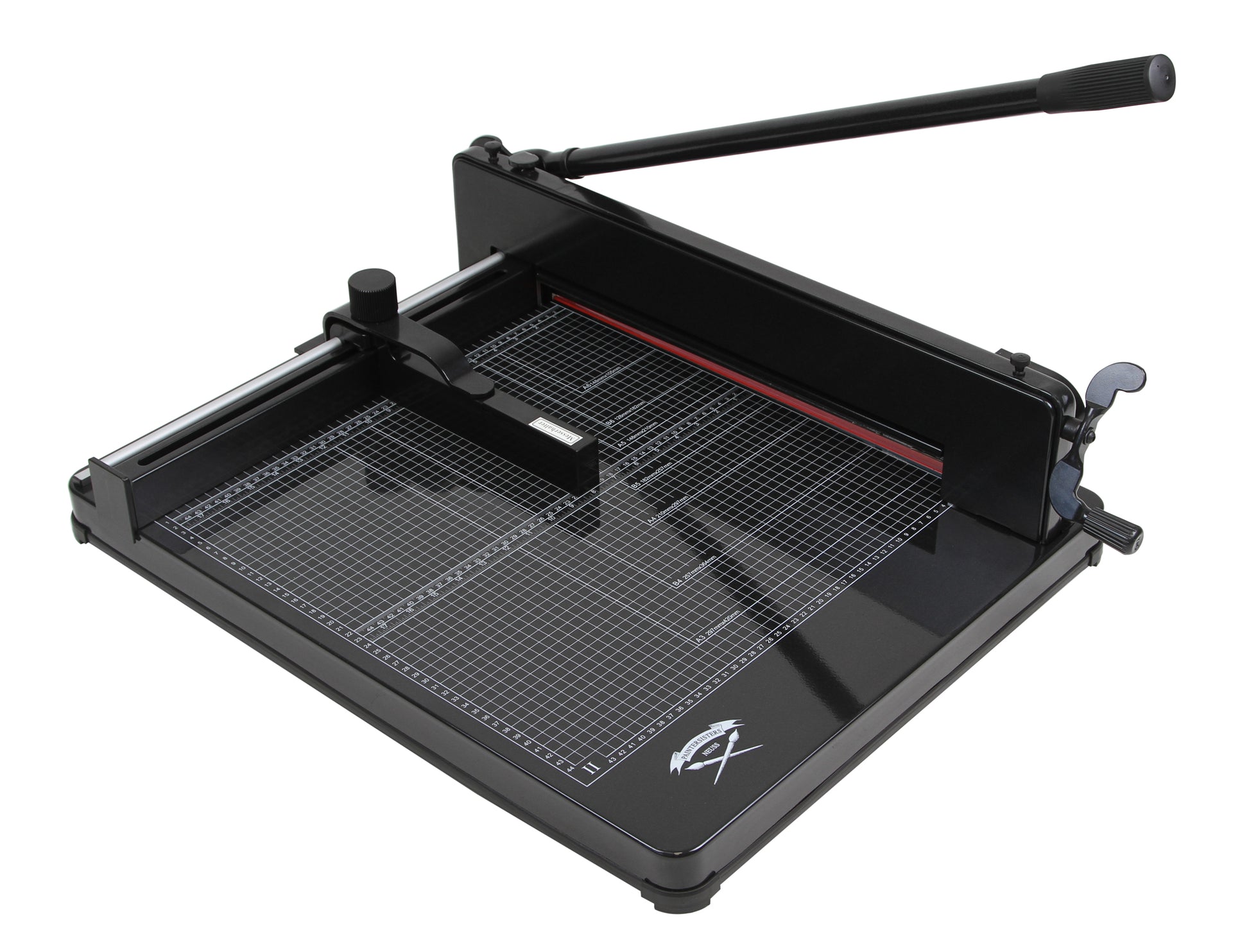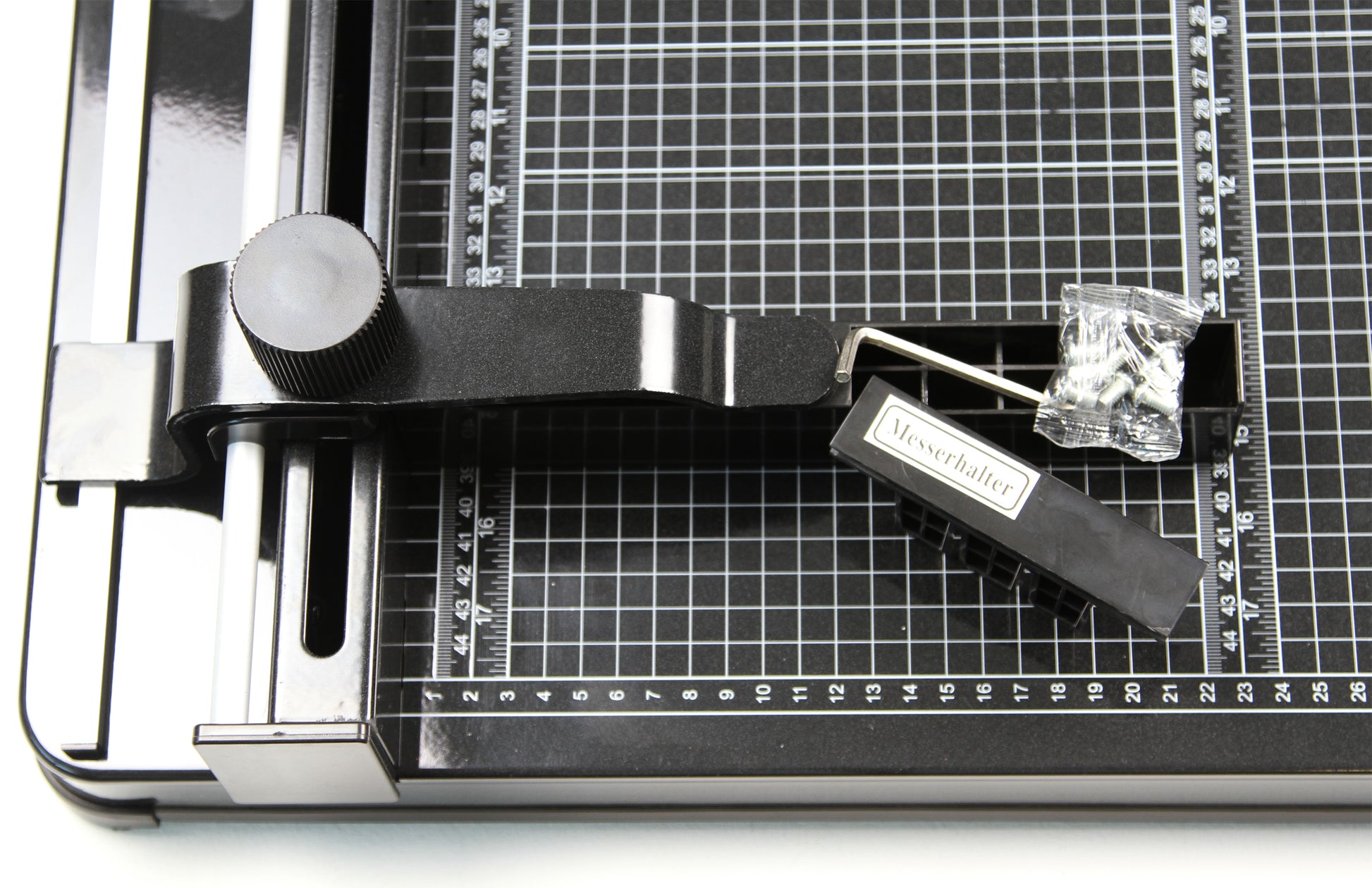 QUALITÄT: Der stabile Stapelschneider aus Ganz-Metall ist vor Allem für die professionelle Papierverarbeitung geeignet. Das Schneidmesser ist aus massivem HSS Stahl, es ist extrem scharf und hat eine lange Lebensdauer. Um dicke Stapel zu schneiden, wird das Messer über eine spezielle Mechanik in einem Bogen nach unten geführt. Dabei taucht das Messer zuerst am Anschlag in die Schnittleiste ein. Alle Stapelschneider werden vor Auslieferung Probe geschnitten und auf Funktion getestet.