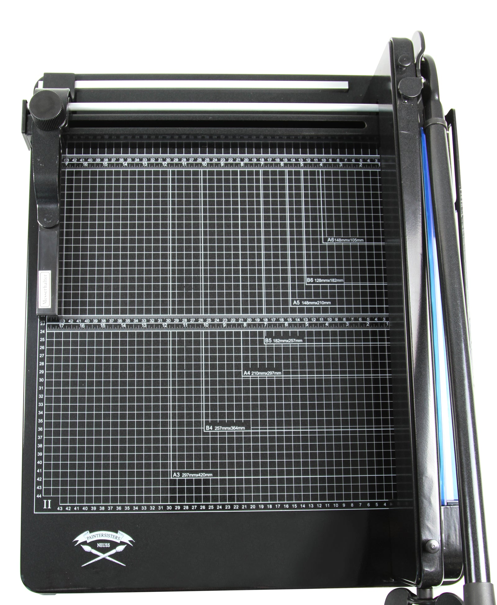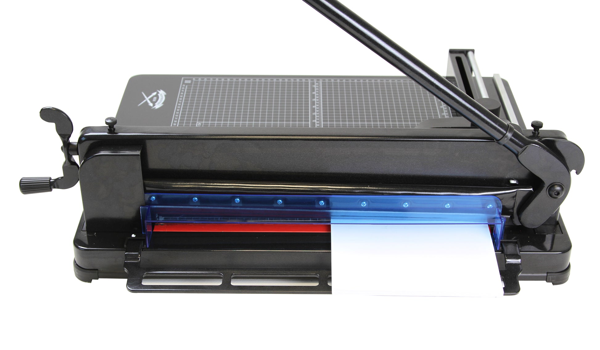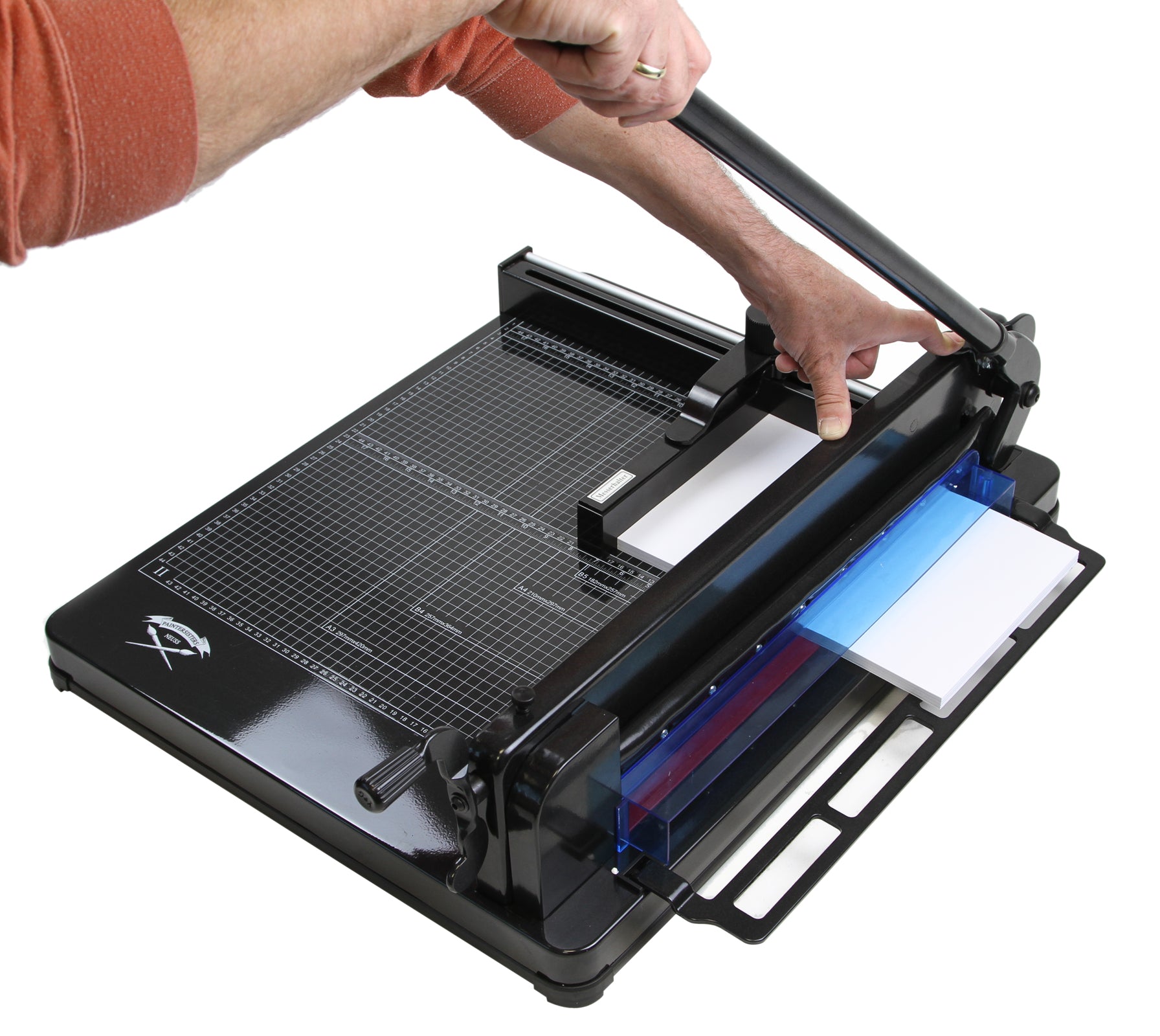 MASSE: Das Gewicht des Stapelschneiders beträgt ca. 26 kg, die Grundfläche ist ca. 67 x 49 cm. Sie können Materialien mit einer Schnittlänge von max. 43cm und einer Höhe von 38 mm schneiden. Die seitliche Zuführung ist bis max. 40 cm möglich.