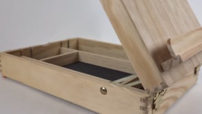 Hochwertiger Koffer aus Kiefernholz FSC® mit zwei messingfarbenen Verschlüssen, stabilem Tragegriff aus weichem Kunststoff und vier Gummifüssen für einen rutschfesten Stand. Der Boden des Koffers ist innen gepolstert, der Deckel des Malkoffers lässt sich in eine Tischstaffelei verwandeln auf der Keilrahmen bis 60cm Höhe eingespannt werden können, der untere Bildhalter trägt Keilrahmen bis 19mm Stärke, dank der Kante können die Keilrahmen nicht herunterrutschen. Der Neigungswinkel ist stufenlos verstellbar.