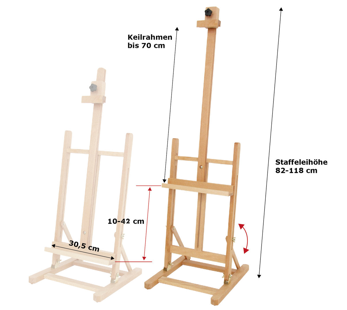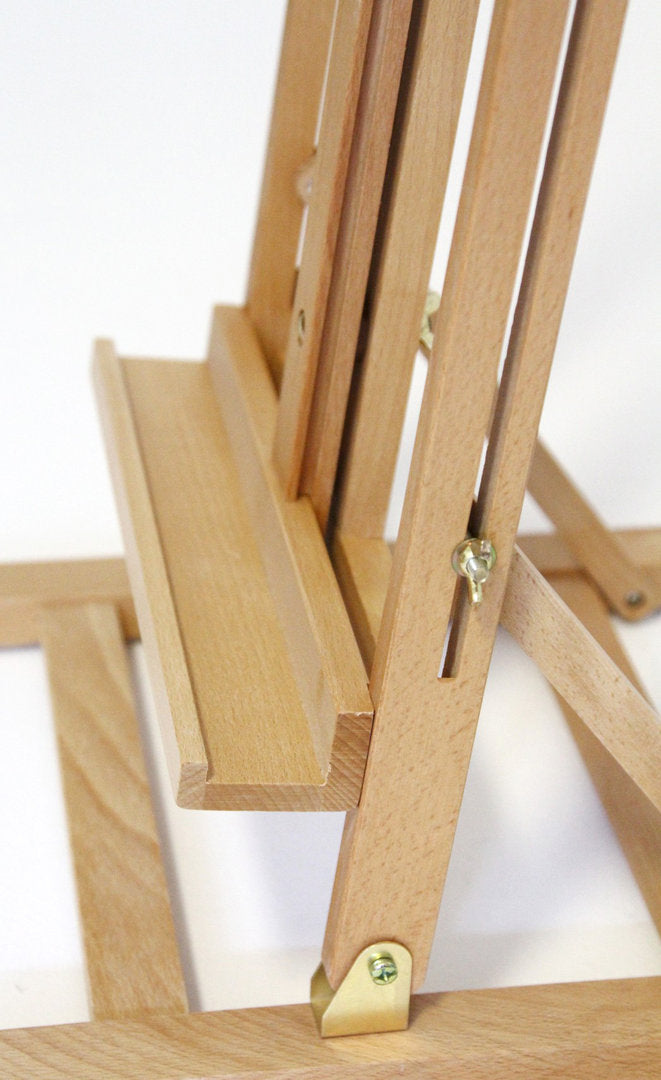 Das hochwertige und harte Holz sorgt dafür, dass alle Verstellungen auch langfristig einwandfrei funktionieren. Der Malwinkel und die grosse Bildauflage - auch für 3D-Keilrahmen bis 38 mm Stärke - sind individuell einstellbar, die Staffelei hat Gummifüsschen und damit einen stabilen und rutschfesten Stand.