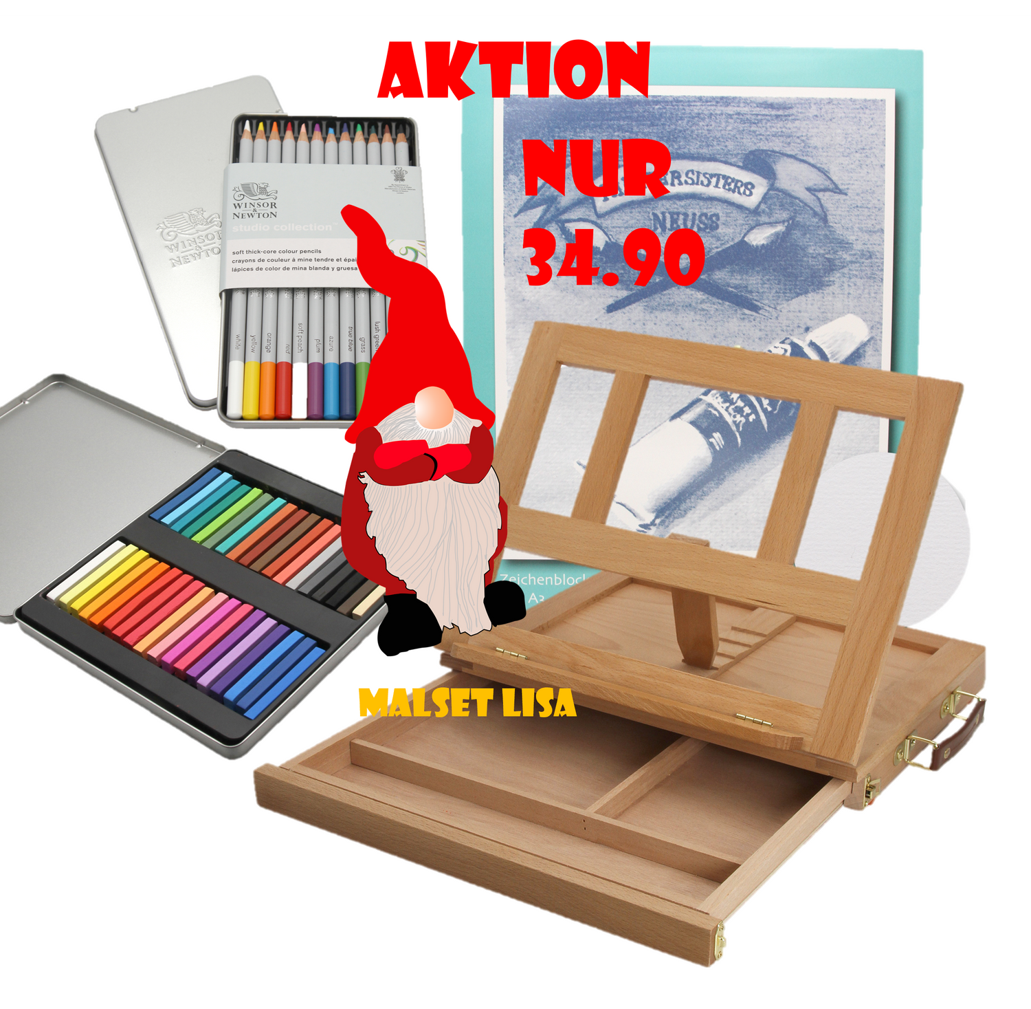 Tischstaffelei Lisa mit Koffer, A3 Malblock für Pastellkreiden, 12 Farbstifte Windsor&Newton, 36 Paintersisters Softpastellkreiden
